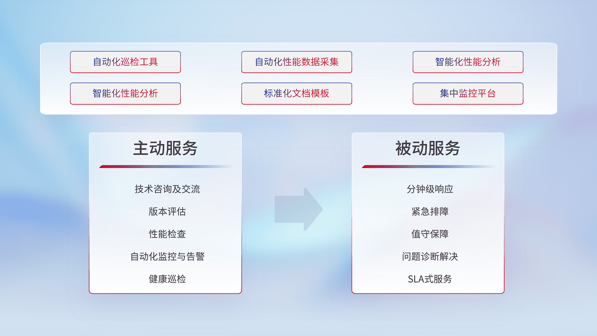 智能化工具和标准化文档,,,保障服务质量,,,提供主动服务(包含技术咨询、、、、版本评估、、、性能检查、、、自动化监控与告警、、、健康巡检)和被动服务包含(分钟级响应、、、紧急排障、、、、值守保障、、问题诊断解决、、SLA服务)。。。